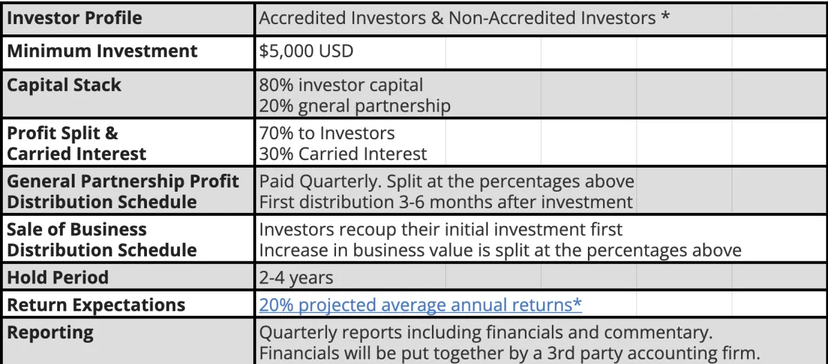 Apart from investing your capital and choosing which portfolio manager you want to work with, this investment will be completely passive. You will not have access to the portfolio manager to ask questions or give your input on how to run the business. You will simply receive a quarterly report and a quarterly payment for each deal you invest in.